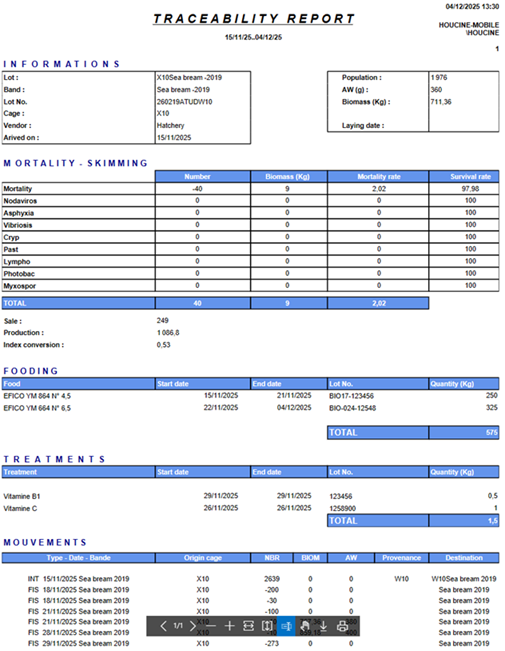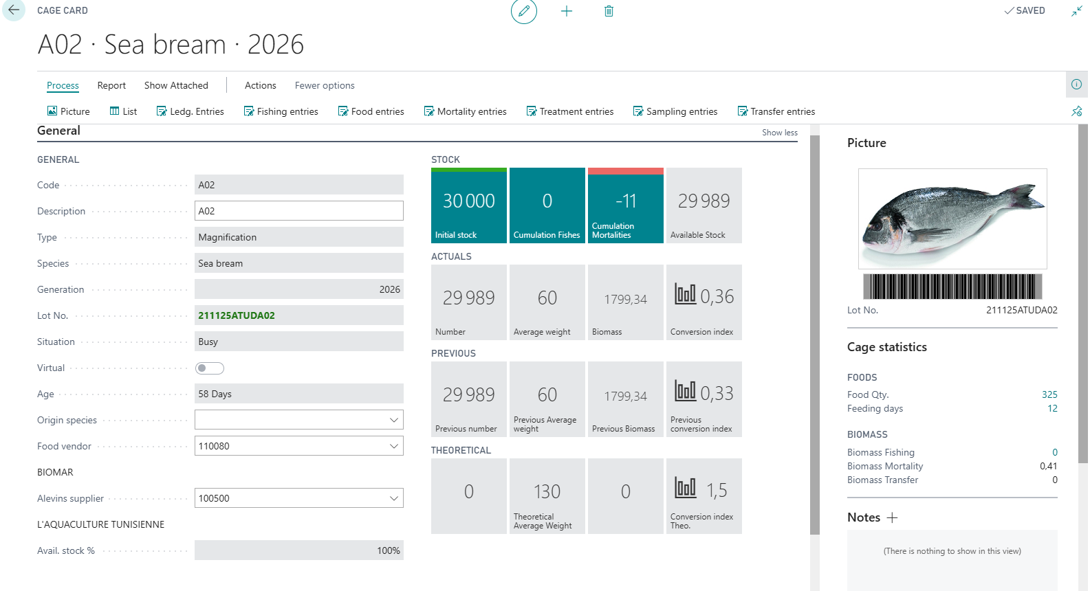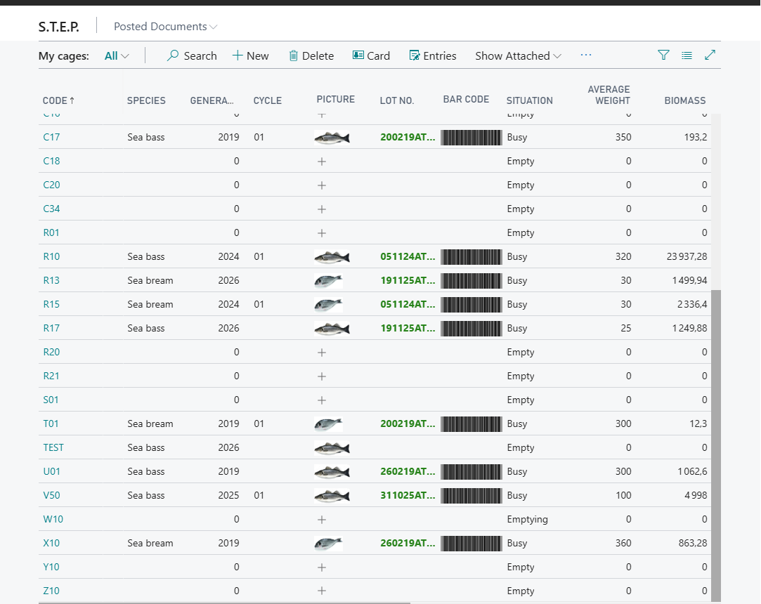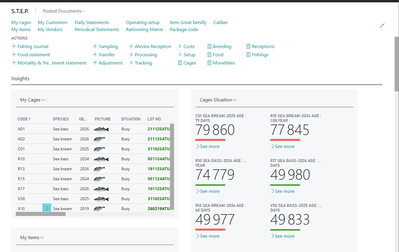 Microsoft Business Central 365, and specifically the management module of cages, includes all features to digitally record the daily actions performed on your production site (feeding, treatment, mortality, Sorting and transfers, fishing, analysis of the physicochemical parameters, etc.) and periodic actions (sampling, Empting, Maintenance cages & nets, etc...).