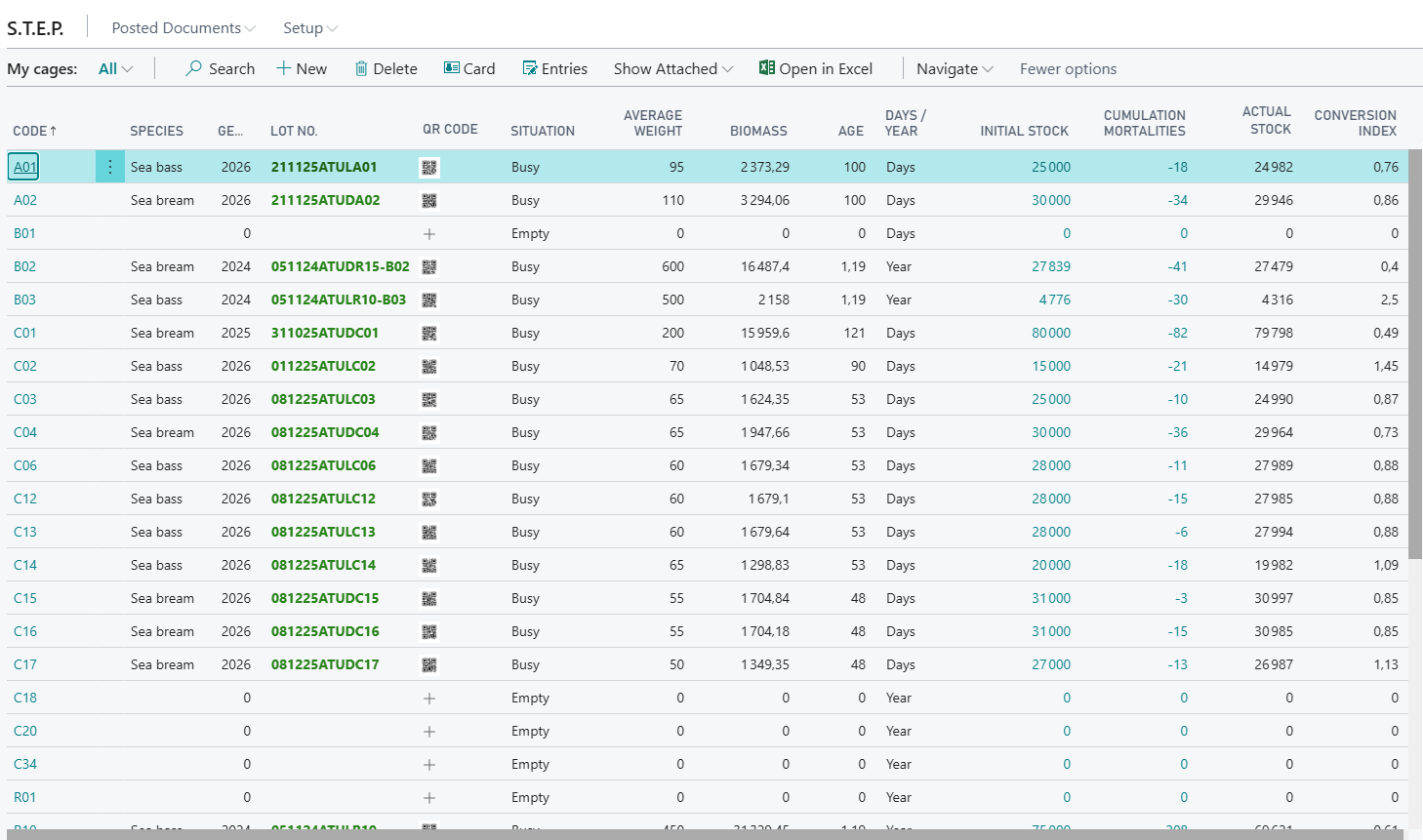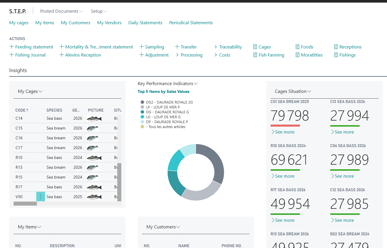 Microsoft Business Central 365, et plus précisément le module de gestion des cages, regroupe toutes les fonctionnalités permettant de consigner numériquement les actions quotidiennes effectuées sur votre site de production (Alimentations, Traitements, Mortalités, Tris et Transferts, Pêche, analyse des paramètres physico-chimiques, etc.…) et les actions périodiques (Échantillonnage, Vidange, Maintenance cages & filets, etc.…).